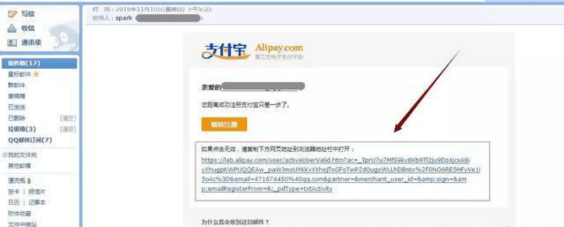 第五步:系統會將驗證郵件發送到之前填寫的郵箱。登陸該郵箱,在收件箱找到來自支付寶的郵件,并點擊網址鏈接,完成郵箱郵件驗證。