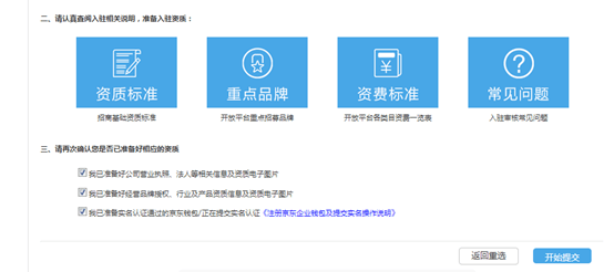 5、查看京東平臺入駐相關(guān)資質(zhì)要求,確認后點擊開始提交