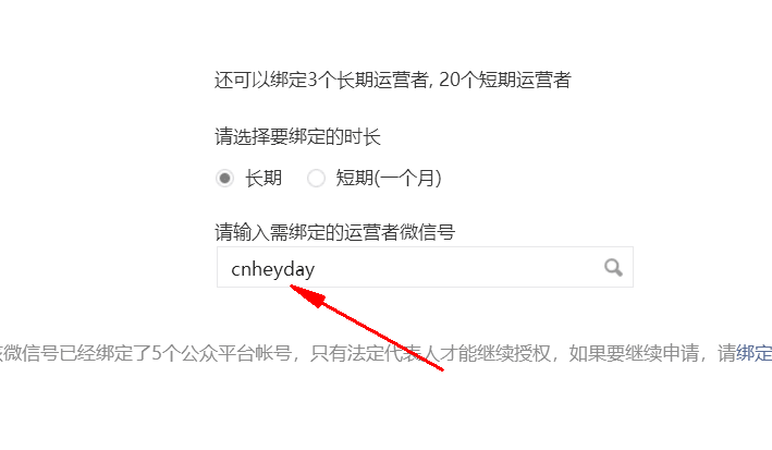 6.綁定的時長,選擇長期. 輸入需要綁定的運營者微信號(有2個號需要綁定): cnheyday(盛世傳媒陳經理號) sscmwlyyh(盛世傳媒運營號)